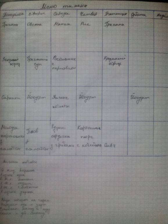 И так базового меню у меня нет. Я просто каждую неделю составляют меню отталкиваясь от того что есть в моём холодильнике. Главное чтобы был основной ингредиент все остальное подкупить можно.