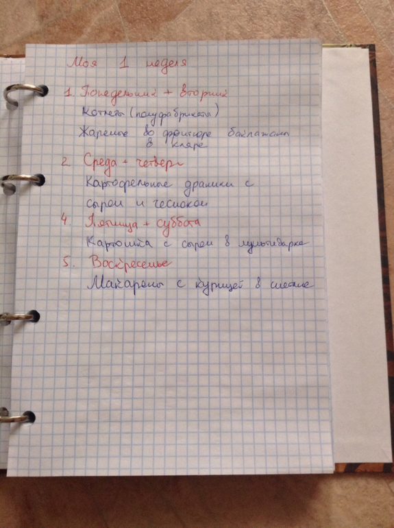 Отчитываемся по заданиямПрежде чем показать свое меню на неделю, хочу оговориться: из взрослых я в семье одна. Детское меню я не записывала. Кроме того, у нас сейчас жуткая жара и совершенно нет аппетита. Я только сегодня доела, сделанное в воскресенье. Поэтому меню у меня очень короткое. Приготовленное естся и на обед и на ужин. На завтрак я пью кофе с какими-нибудь печенюхами. Не готовлю. Итак, меню: