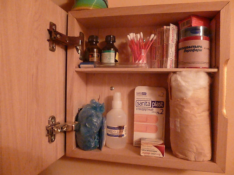 в коридоре на стене. перекись, йод, зеленка, вата, пластыри, термометр. еще бинты надо докупить.