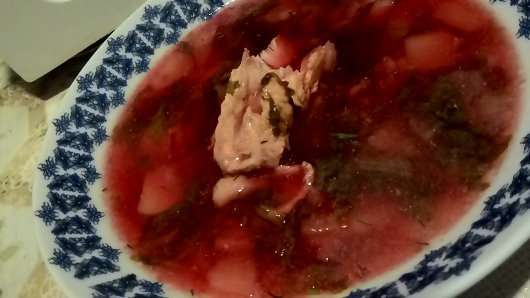 А на ужин борщ с курицей, молодой картошечкой, свеколкой и зеленым салатом вместо капусты