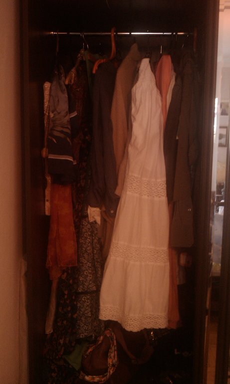 два года я не ношу брюки-джинсы (только на спорт и в лес), так что тут живут только платья и юбки, а теперь им стало просторней. Плюс я запланировала крючки для сумок и шляп.
