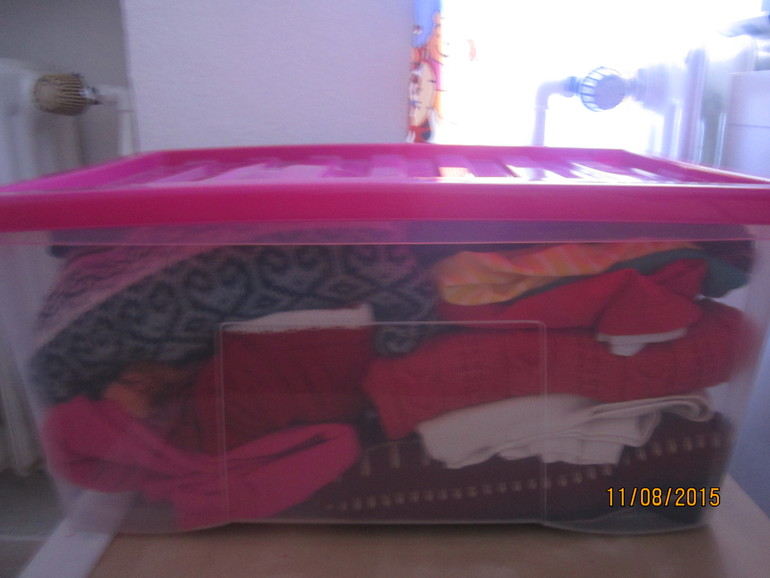 Два свитера и 4 футболки пошли в мусор. Остальное сложила в ящик, решала, что все, что останется в нем нетронутым (то есть не понадобится) до 1 января, пойдет сразу в мусор или на продажу. Вот ящик для хранения