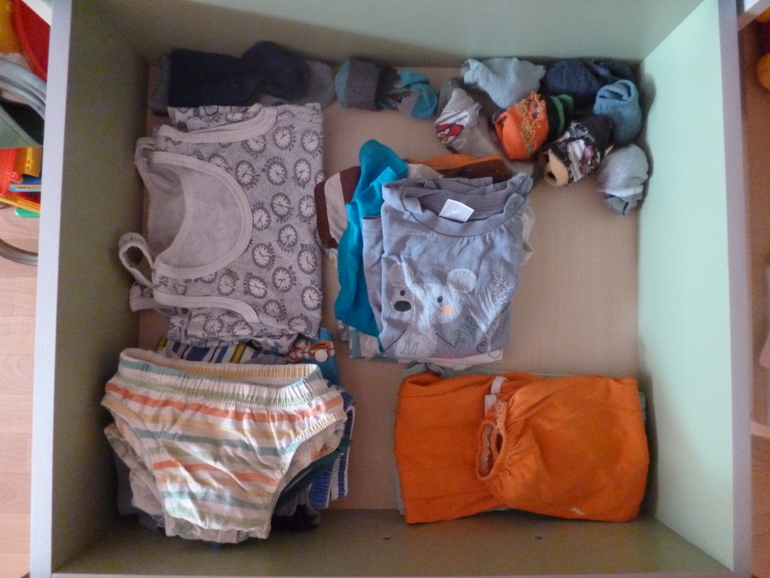 сейчас у сына два ящика: одежда для прогулок и для дома (+трусы-носки):