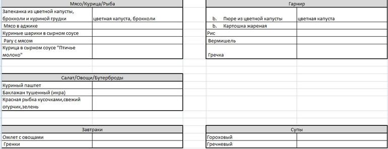 Меню как обычно у меня просто списком блюд без привязки к дням