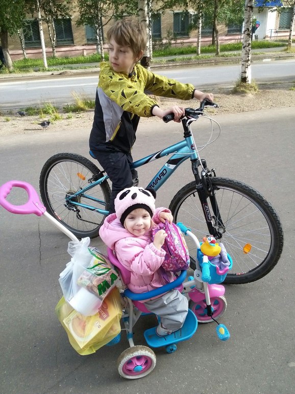 После садика зашли в магазин за продуктами, обратите внимание, как я везу пакеты :-) сын все это датащил до дома, а мы пошли в парикмахерскую
