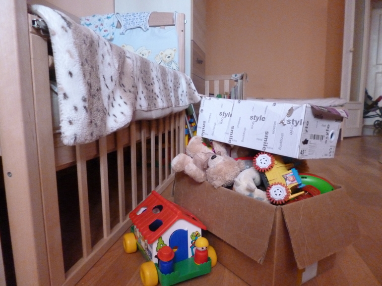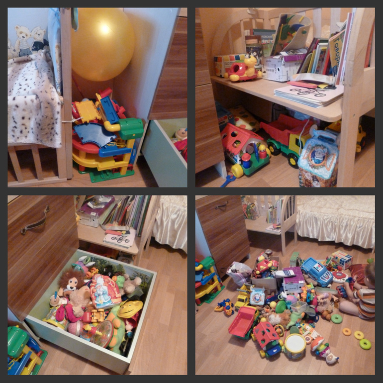нижний ящик шкафа, бывшая кроватка - теперь стол (книги, кубики сверху, внизу коробка с игрушками и машинки) и место между шкафом и кроваткой - гараж с его запчастями и фитбол.