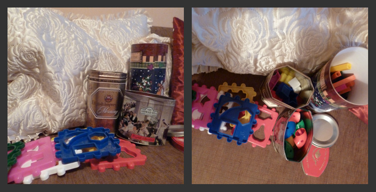 отнесла на места контейнеры (сын похитил с кухни ))), крышки от банок, жестяную коробку из-под чая. её, кстати, я пристроила под восковые мелки.