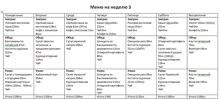 Составила меню на следующую неделю....попыталась просчитать калорийность. Вот что получилось: