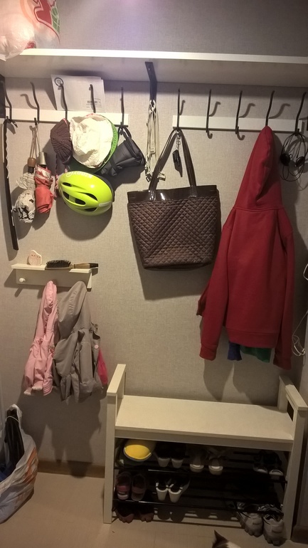 Хочу заменить детские крючки (а то их всего три) и сбоку подвесить корзинки системы АЛЬГОТ. Для детских и взрослых шапок шарфов и т.д.