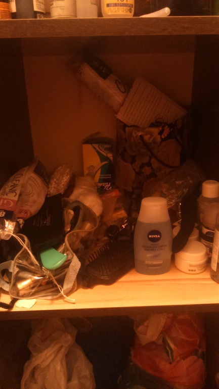 Для расхламления решила взять две полки в шкафу. С косметикой и полочку под ней - с пакетами. Этот шкаф стоит в прихожей. И если бы он был открытым, то получился бы знатный хот-спотище))) вот до