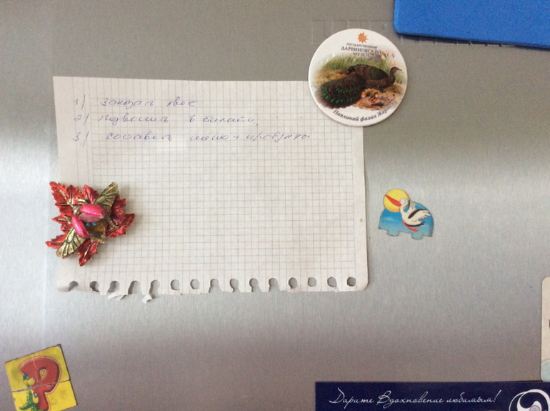 У меня давно заведены листы- напоминалки на холодильнике, в которые я записываю то, о чем могу забыть, например, когда надо делать очередную прививку животным или когда в школе родительские собрания. Когда список становится неактуальным- я его выбрасываю и вешаю новый. В него легко что-то дописать, легко заменить, если испачкался, да и лист к холодильнику легко крепить любым магнитом, а календарь с удобными окошками для записей не повесишь на простой магнит. Ну, а почему именно на холодильник, думаю, очевидно: мимо не пройдешь и сто раз заглянешь, причем все домашние, а не только ты. Единственное, я думаю купить магнитную мягкую доску для холодильника, с мелом. Видела давно в интернете, но тогда мне было неактуально. Не знаю, насколько она удобнее, но выглядело на фото стильно.
