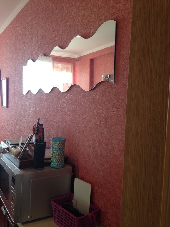 РзНе, зеркало из мерлена. Да не прикол, личная заморочка. Вообще со времён, когда я бариста работала я мечтаю дома иметь банную стойку. Но её мне впихнуть некуда. Зато есть длинная кухня:) и место над тумбочкой (ну или как это назвать) пустовало, зеркало так и просилось в моем сознании. Как в баре:) ещё бы полочку стеклянную под ним см 10 глубиной. Я хотела, чтобы была одна не такая частая и как бы 2 зеркала (2 такие волны рядом.) но продавалось такое))