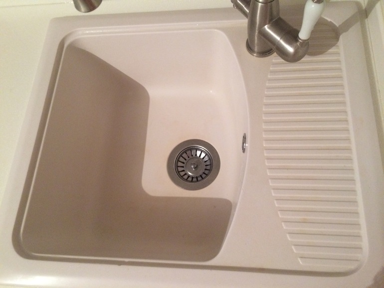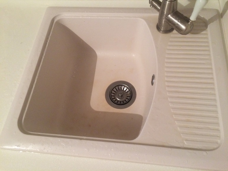 Знакомьтесь, это моя раковина на кухне. 100 раз пожалела, что выбрала такую светлую раковину из камня, на ней постоянно остаются пятна, отмыть дочиста её можно только агрессивной химотой, но я сейчас стараюсь использовать неагрессивные чистящие средства, т.к. малыш в доме.