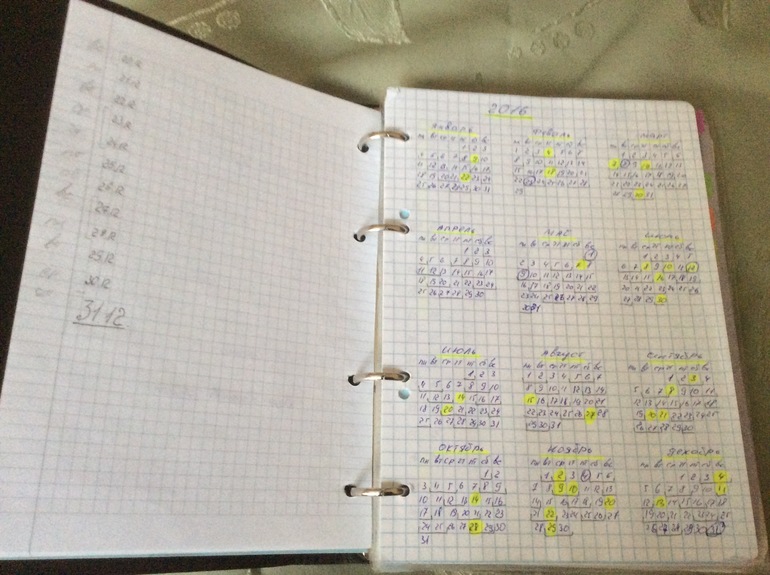 Опытным путем пришла к тому что в самом начале тетрадки мне нужен календарь, пишу его сама сразу на год ( одна страница - один месяц, на 2016 сделала еще календарь на 12 месяцев на одной станичке)