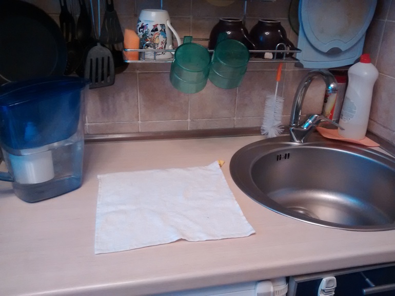 Раковина чистая, пространство рядом с раковиной тоже в порядке