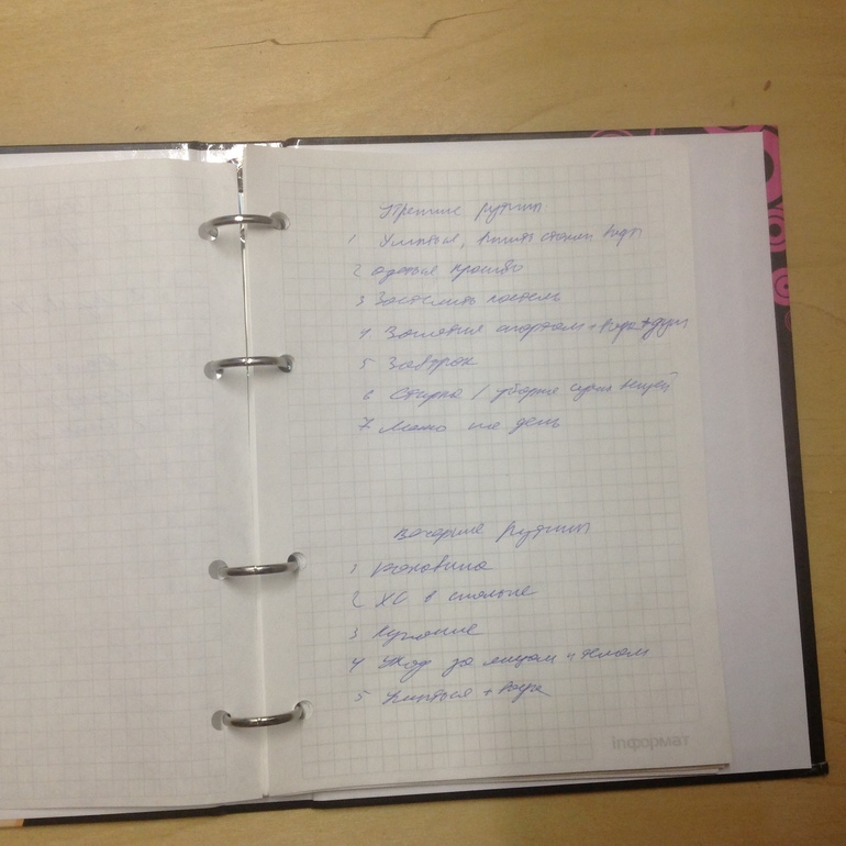Написала зоны и утренние и вечерние рутины, которые обычно делаю. Из нового спорт и раковина.