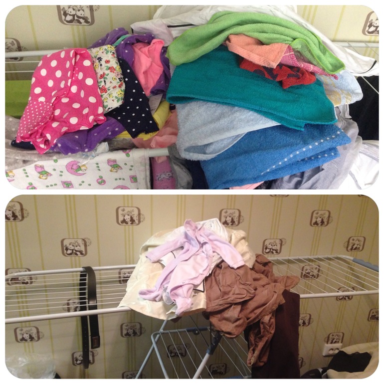 1. Детская комната у нас без мебели, мы её называем гардеробной , т.к там шкаф наш, гладильная доска и сушилка для белья . Вот эта комната моментально превращается в горячую точку чистого не глаженного белья , т.к я строго решила не класть в шкаф наглаженное белье, образовывается кучка постепенно, плюс на гладильной доске если вечером не убрали в шкаф... В общем точка, так точка, но разгребла её быстро очень, ушло вместо поставленных мною 15-7, т.к гладила потом( и то осталось 3 вещи ещё догладить )