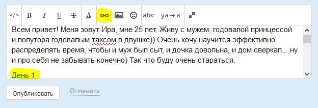 Кликаете на скрепочку и в появившемся окне в первой строке указываете ссылку, во второй название "День 1"![]()