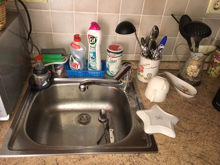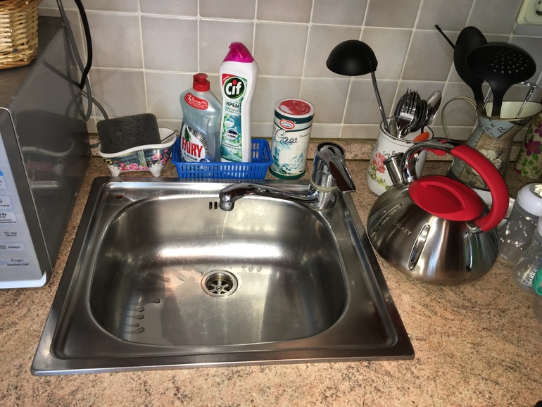 Все чем я пользуюсь на кухне,видно на фото) Это фери,незаменимая для меня вещь крем Cif, им я и чистила раковину. И пищевая сода)