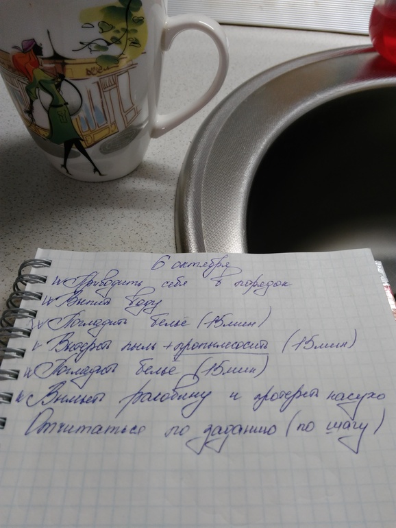 Отчитываемся по заданиямСегодня сделала все что нужно, что то получилось немного больше,а на запланированную мелочь не хватило времени. Вот было у меня же написано 15 минут на глажку,но 2 раза,нет я пока все не перегладила(даже утюг выключился от перегрева)))))не успокоилась. итог вроде бы довольна,но вместо 15 минут я стояла около часа(устала и чувствую что переборщила) зато с другим занятием 15 минут почти уложилась, правда я написала два дела(пропылесосила за 16,5 минут, а вот пыль не успела протереть...не думала что пропылесосить у меня так долго займет времени. Вообще заметила, что многое от настроения зависит. старший ребенок снова заболел и я какая то кислая стала,но ничего-главное что все сделано.