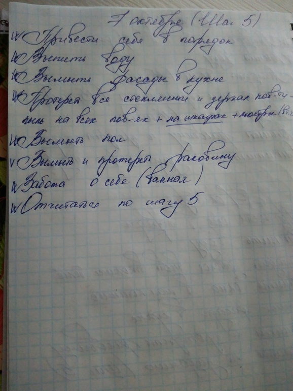Отчитываемся по заданиямЗадание выполнила. Заботу о себе добавила в задания. Все выходные думала а что же такое забота о себе... можно ли хобби к этому причислить? Походы в магазин на побаловать себя? Или все таки это забота именно о теле. Задания почти все выполнила, решила что буду делать именно 15 минут,если звонок прозвенел, то я останавливаюсь. Удивилась,что успевать стала больше с этими 15 минутками. Единственное,что я перед сном не успела-это вымыть посуду и натереть раковину,она весь день у меня была чистой и сияющей,а вечером я затеяла пирожки испечь,тут ребенок младший раскопризничался и я уснула,пока его кормила... вот сложно мне в форс- мажорных ситуациях следовать системе.