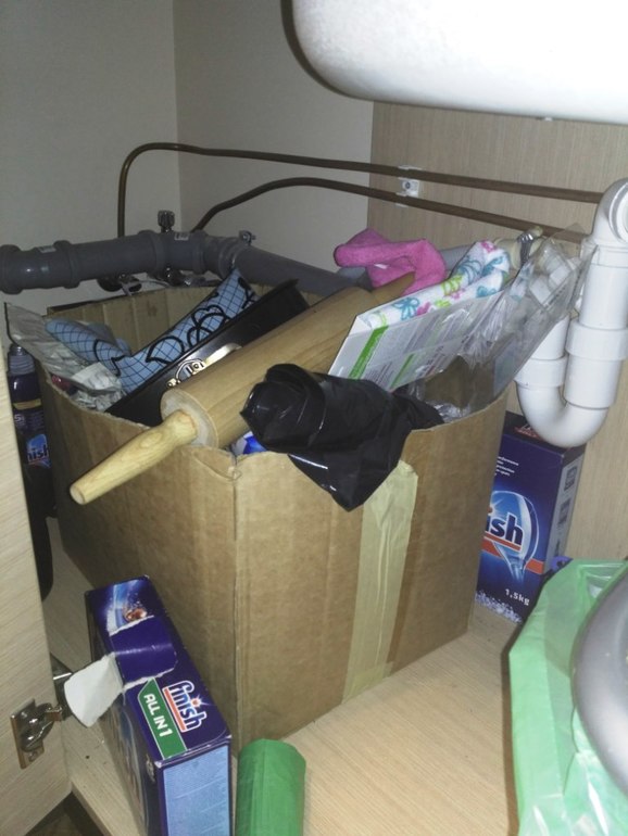 - найти и установить полки на внутреннюю дверцу шкафа под раковиной - на фото с картонной коробкой слева (туда уйдут тряпочки, перчатки и прочее)