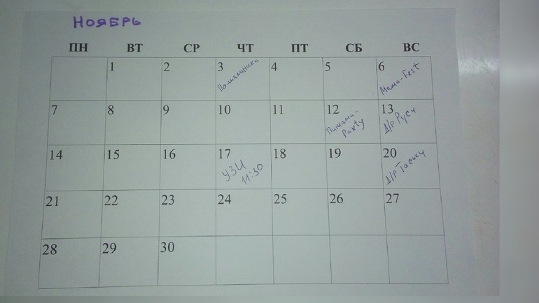 Быстро накидала то, что вспомнилось в первую очередь. По ходу буду дописывать. Распечатала и повесила на холодильник. Сомневаюсь что кому_то кроме меня он там нужен. А второй такой же вклеила в КЖ, но он уже более подробный, с моими делами. Посмотрим что приживется.