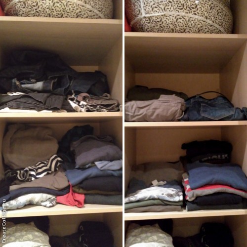 В качестве расхламления сегодня решила навести порядок на 2 полках с одеждой мужа. Убрала все летнее, все несвежее отправила в стирку, остальное сложила аккуратно. Пару вещей под шумок выкинула, то что точно знаю муж больше не наденет - вышедшая из моды рабочая одежда. Выкинула бы и больше, но без разрешения не хочу, а уговорить - нереально. Вытащила белые джинсы, которые 100% ему малы. Померил, еле-еле налезли, вид атас, лучше не дышать и не шевелиться :) Сказал, что будет худеть к следующему лету и потребовал вернуть на место. В общем, обещал мне следующим летом проходить в них 1 день. Хих, надеюсь после этого даст выкинуть :)