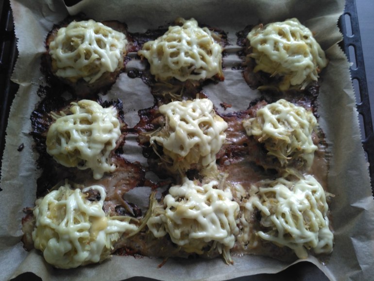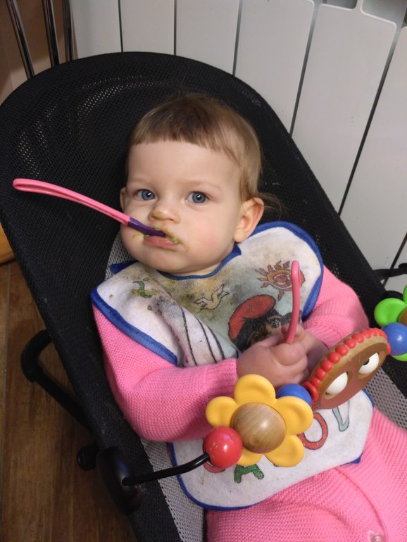 Кормлю дочку завтраком. Обычно мы заканчиваем завтрак грудью, но сегодня я хочу сначала закончить с котлетами. Поэтому дочка сидит в шезлонге, а я с песнями и плясками раскладываю ингредиенты на противне. Наконец, все отправляется в духовку, ставится таймер, и можно на полчаса о котлетах забыть. На кухне бардак, пока не успеваю убраться.