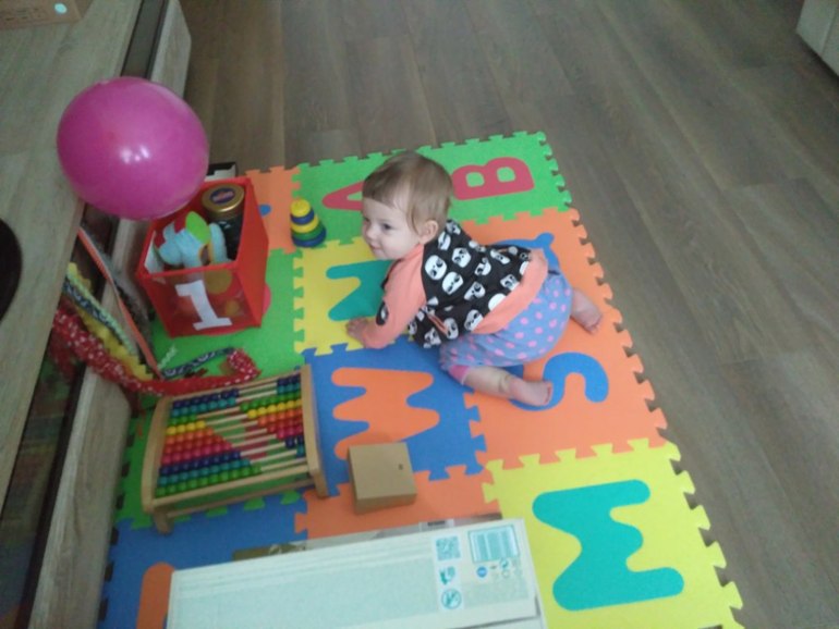 Ребенок проснулся. Достаю ее из кроватки, отношу на игровой коврик. Ребенок сегодня в духе, поэтому спокойно играется, пока мама заканчивает работу.