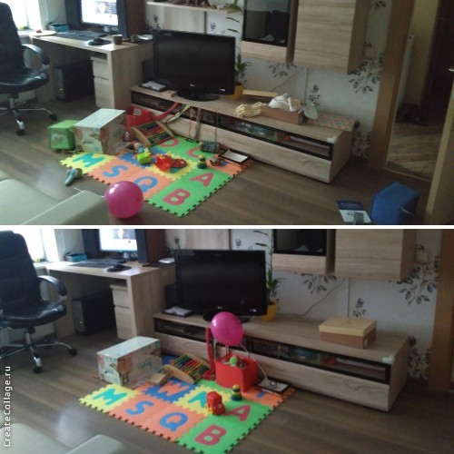 В гостиной 5-минутное спасение комнаты после дочкиных игр.