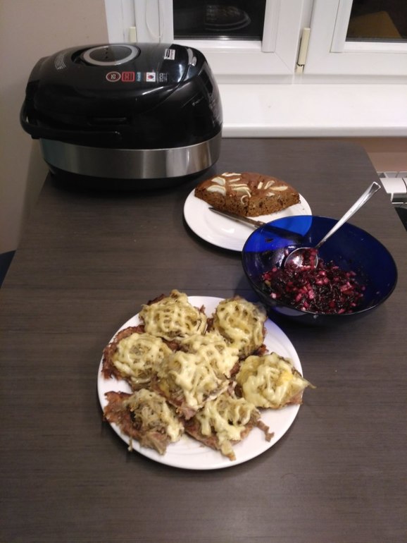 Все, ребенок готов и отпущен на коврик. Теперь можно и самой покушать. Разогреваю вчерашнюю мужнину кулинарию.