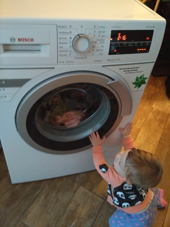 По дороге закидываю детскую одежку в стирку. Заодно отвлекалочка для ребенка :)