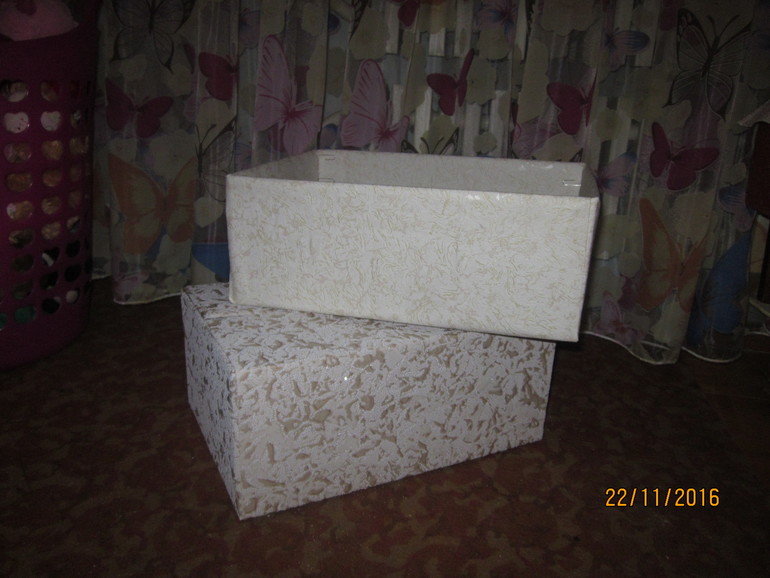 и я подумала - что за безобразие!!!какая страшная коробка!!!надо ее срочно обновить, обои остались, почему бы не использовать их?)) Потом взяла еще одну точно такую коробку(вообще не представляю откуда они у нас взялись), в ней я храню ткани для вышивки и оклеила их обоями, В процессе оклеивания вынула постиранную куртку, повесила сушиться, загрузила в стирку два покрывала. Сейчас коробки в процессе сушки