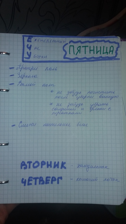 ЕЧУ написала. Это будет пятница у меня. Только кометическую уборку холодильника я записала во вторник - мне так будет легче. даже хотя бы после отбоя детей каждый вторник почистить холодильную камеру от залежалых продуктов и тряпочкой пройтись по грязностям. (Если честно, холодильник у нас всегда грязный и никто его никогда не протирал, только раза 2 в год была чистка).