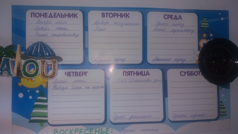 БПН у меня все также на холодильнике. очень удобно и я им постоянно пользуюсь. и всем советую. написала туда мелкие дела по дому, которые нужно сделать раз в неделю, чтобы не запускать до противного состояния. а так же дела по уходу за собой и мужем.