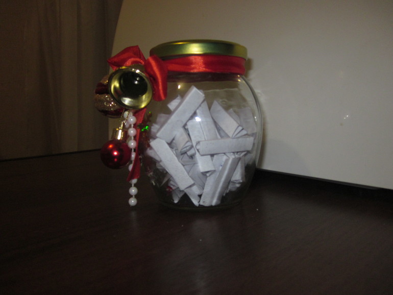 На счет желаний и хотелок - очень хорошая идея, а то у меня эти желания в разных блокнотах на разных листиках все вразброс. Сделала несколько категорий - для дома, одежда, книги и игры, игрушки, рукоделие, спорт, путешествия, разное, и еще оставила немного пустого места. Кстати, в начале этого года я сделала себе "баночку желаний", на маленьких листиках записывала хотелки(то, что можно именно купить), заворачивала и бросала в банку, теперь перед Новым годом открою, буду вытаскивать по бумажке, если мы это купили, бумажку выброшу, если не купили и желание все еще актуально - брошу назад в банку. И в этом году опять хочу написать такие хотелки, только взять бумагу другого цвета, чтобы было видно из какого года желание)))Может глупо, но мне почему-то так захотелось. А вот и моя банка