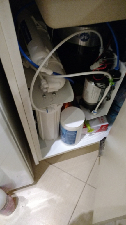 Под раковиной измельчитель и фильтр обратного осмоса, в дополнение немного моющих и перчатки, чтобы были всегда под рукой. Мусорного ведра там нет как такового.