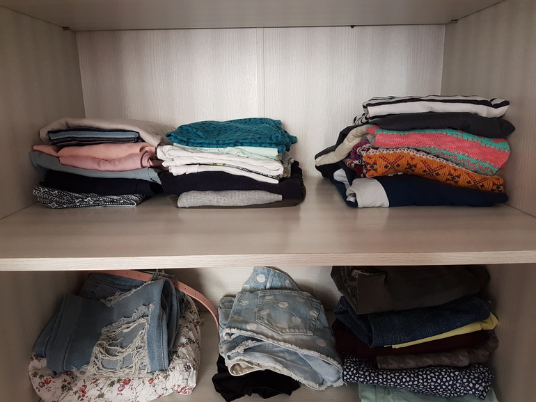 Более продуктивно с разбором вещей. Футболки/толстовки по стопкам разложила, многие убрала в пакет на вынос. Грустно стало на полке, но чисто.