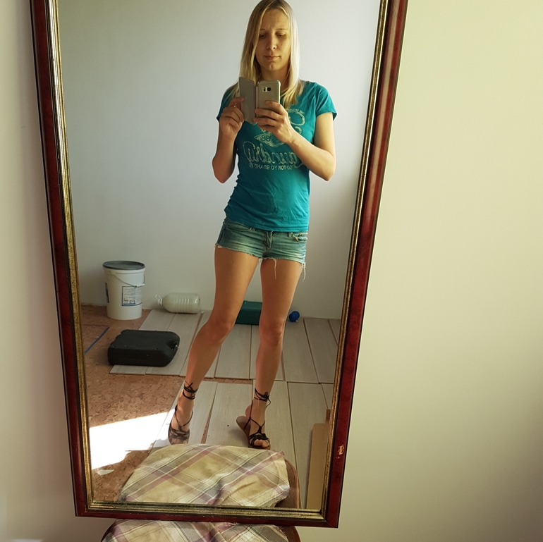 Обувь на шнурках - сандалии, шорты - обрезанные мягкие джинсы, в которых выбегаю к почтовому ящику или окна могу помыть. Ходила, честно. Вывод - не комфортно. Я понимаю, что обувь как бы должна остановить меня от проминания дивана. Но нет, ее снять две секунды и совесть не гудит. Хотя пижамные шортики , пожалуй, можно себе будет завести.