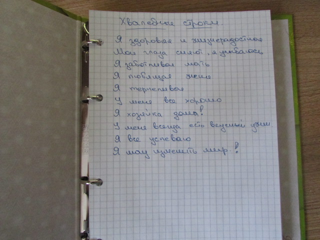 Отчитываемся по заданиямЗдравствуйте, хвалить себя очень тяжело. Обычно мы себя ругаем за не сделанную работу или за лень. Забываем похвалить себя за то, что приготовили обед или за то, что наконец то вспомнили полить цветы или накормить кота. Мы не замечаем, что когда ругаем сами себя так же делают наши родные. Они видят, что действительно, пол не подметен или бельё не поглажено, пыль на полке, но не видят как много сделано другого. В прошлом взлёте я постоянно себя ругала за лень, забывая хвалить. Потом я записала "хвалилки", чтобы не забывать.