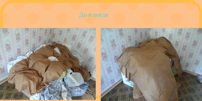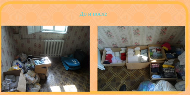 Одной из самых больших проблем, как я думаю, являлось абсолютное отсутствие шкафов и нецелесообразность их приобретения. Как итог, вещи валяются по всему дому, чтоб что-то одеть, нужно сначала это найти и т.д. Во время взлета эта проблема на 100% не решилась, но я работаю и есть сдвиги. В этом мне помогли не только задания, но и отчеты других участников. Там что-то подсмотрел, там какую-то идею увидел, там кто-то опытом поделился. Это очень полезно. Сейчас я сортирую, выбрасываю и раскладываю по картонным ящичкам. Пусть не особо красиво, зато лучше, чем в пакетах. И, да, на это нужно всего 5 минут в день.