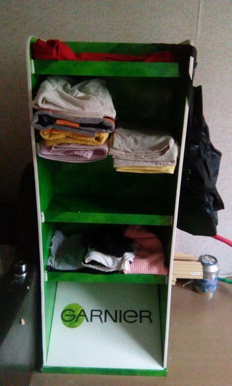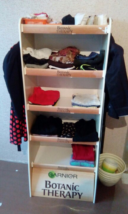 Т.к. и шкафов у нас еще нет - стырила с работы ненужные дисплеи. Очень удобные кстати))) кошки вот только иногда в них прыгают, "порядок" наводят. Кота отвадить удалось, а кошка все же иногда залазит, бессовестная. Она у нас вообще чудная - сама по себе, на енота иногда похожа)))))