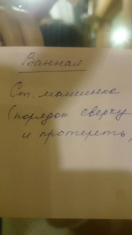 Иногда на зеркалах появляются вот такие стикеры, которые несколько дисциплинируют и как бы взывают к совести (их же все видят, и они висят до тех пор, пока дело не сделано):