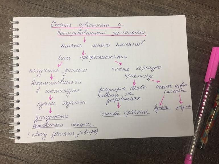 В результате ваше работы, должна получиться блок-схема. Она не должна быть проработана слишком детально, в ней должны быть отражены только основные моменты. Главное условие, все ветки схемы должны быть доведены до самых первых шагов. Это те действие, которые вы можете сделать сегодня или завтра.