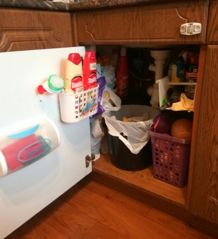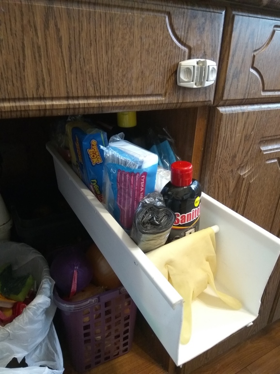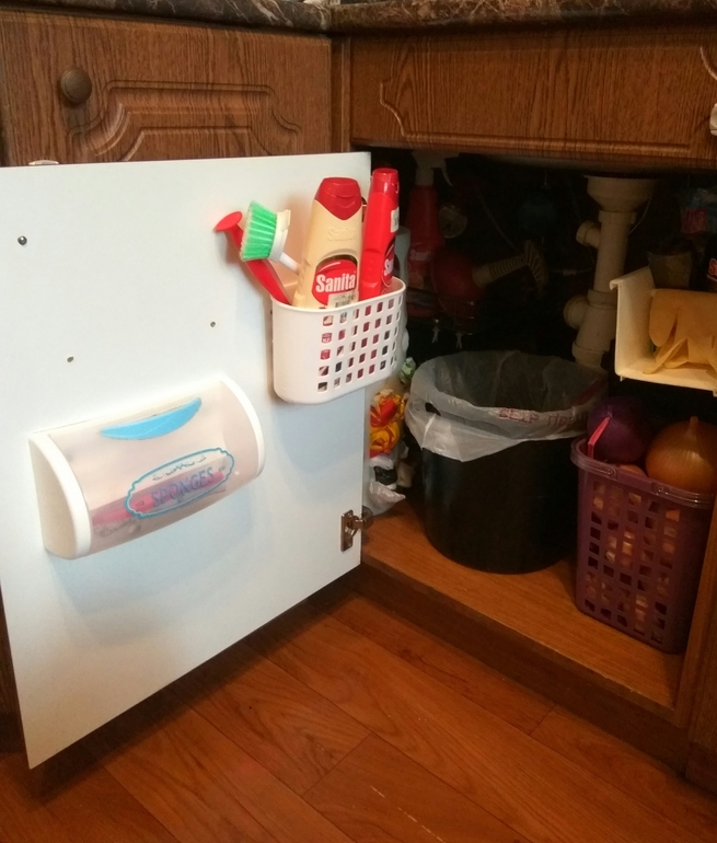 В выдвижном ящике расхламлять нечего, поэтому просто заменила на новую губку для посуды и протерла сам ящичек.