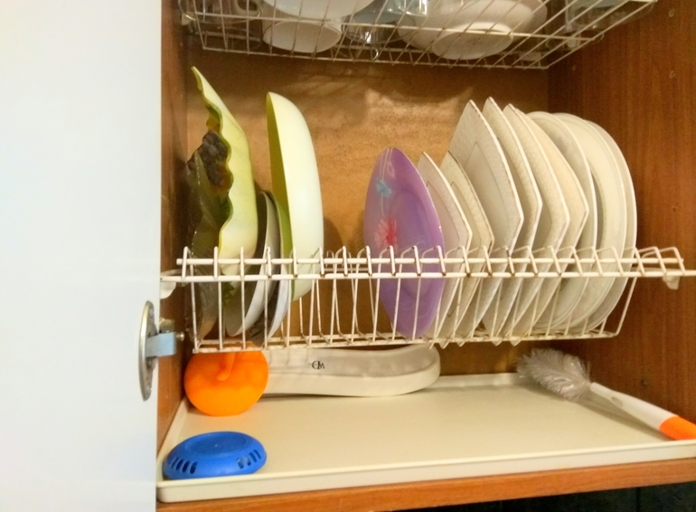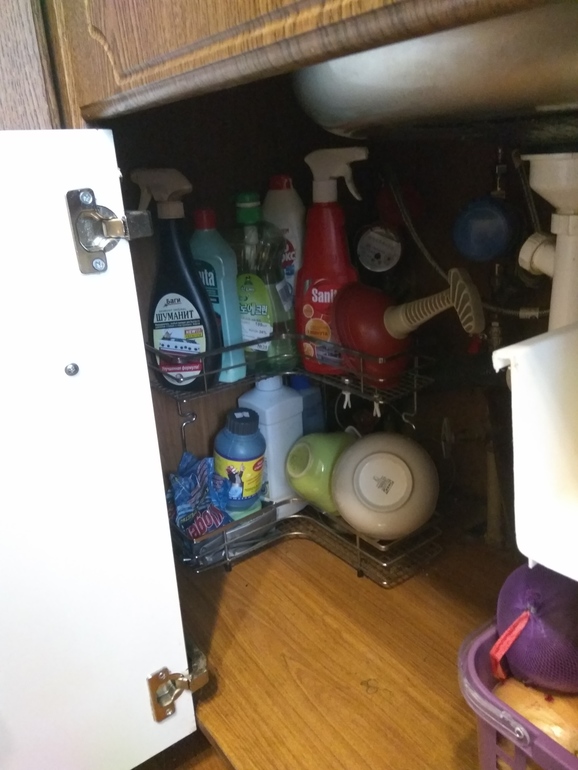 В глубине шкафа у меня стоит угловая полка для ванной из старой квартиры. Удобно хранить моющие средства. Выкинула бутылку которая не понравилась в применении.