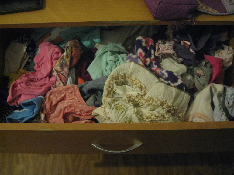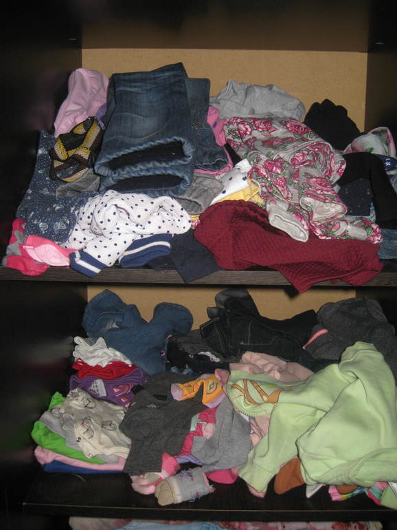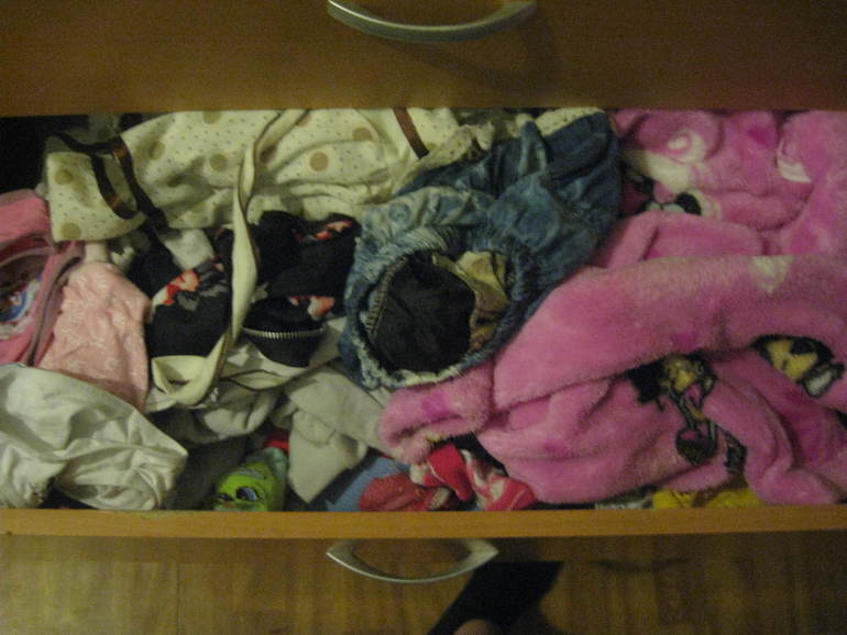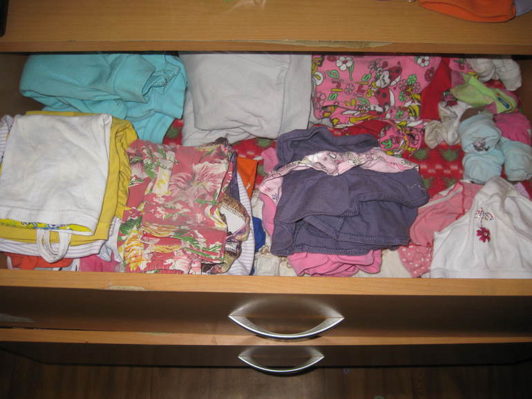 Далее расхламление, сегодня это детские полки, в тумбочке одежда для дома, в шкафу на выход. Та что для дома перерывается по 5 раз на день, у меня же принцесса!!!