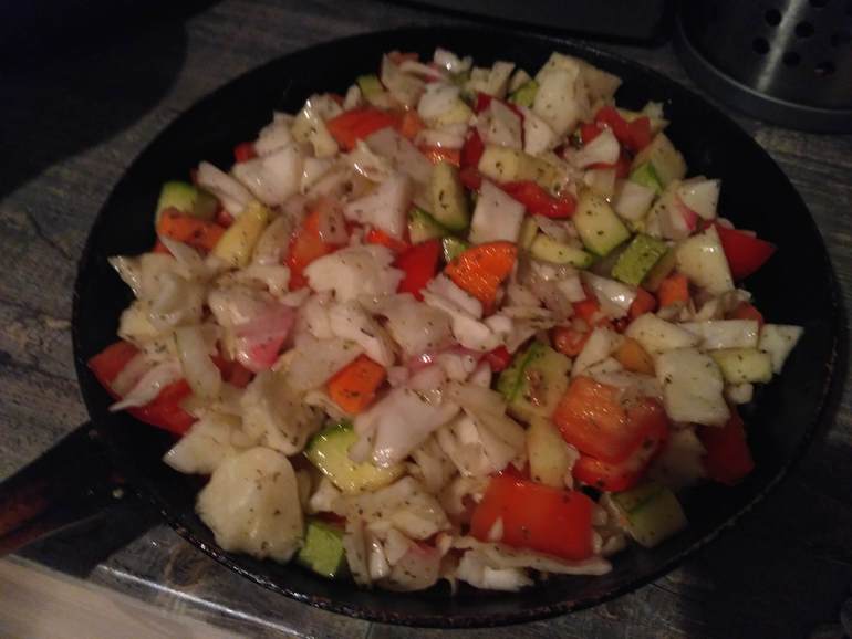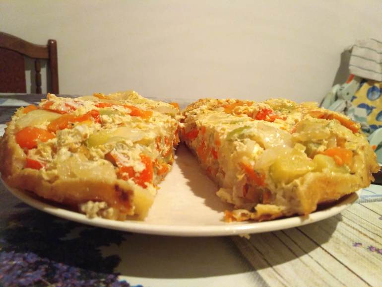 - овощной пирог. Нарезаю овощи: капуста, морковь, кабачок, лук, перец(все что душа/желудок просит) брусочками, добавила сушёную петрушку, щепотку соли, перемешала, положила в форму