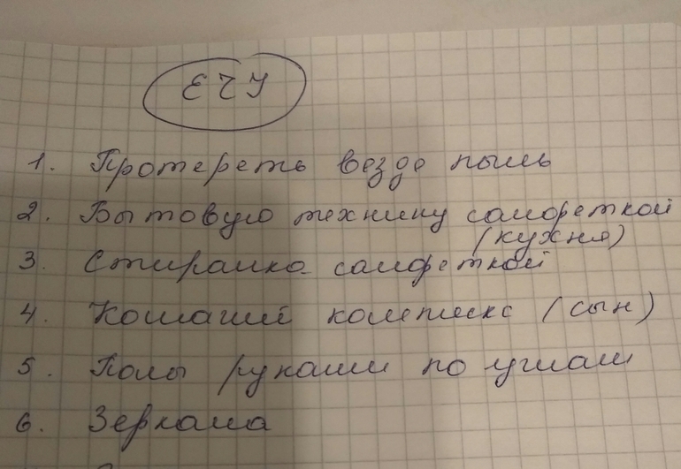 Эстафету выполнила, протерла в спальне все горизонтальные поверхности. Заодно дверки шкафов снаружи и внутри. И мой ЕЧУ вырисовывается такой